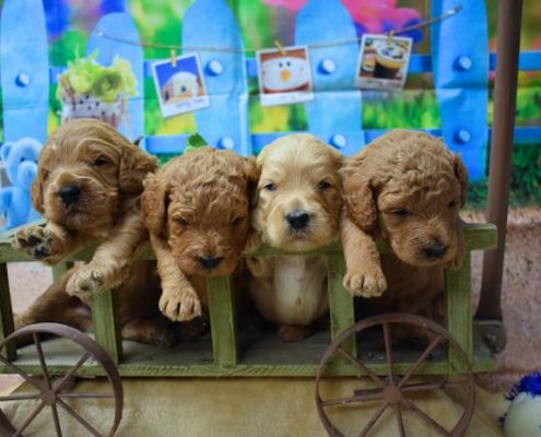 Last, but not at all least our newest litter is stunning, F1 Medium English Teddybear Goldendoodles have arrived and are now weaned and will be ready for their homes in a few weeks. For limited availability call soon! Females and males still available.