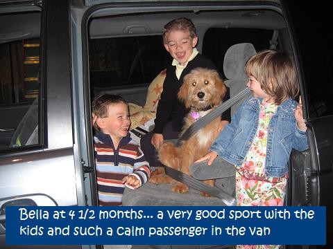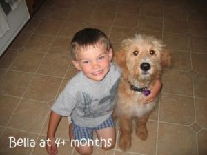 At four months, Kona is fully housetrained, has learned to sit, lay down, and stay as well as some cute tricks like shaking a paw, “speak” and playing hide and seek with our two children (ages 4 and9).